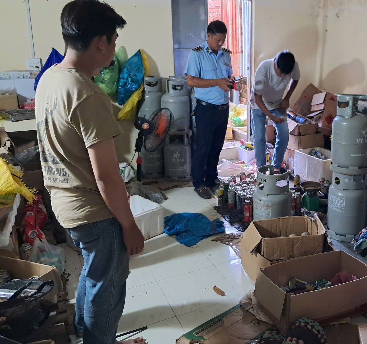 Tại thời điểm kiểm tra, Đội Quản lý thị trường số 1 phát hiện Hộ kinh doanh TC đang thực hiện hành vi chiết nạp LPG (loại 12 kg) hiệu VT Gas vào chai LPG mini không được phép nạp lại.