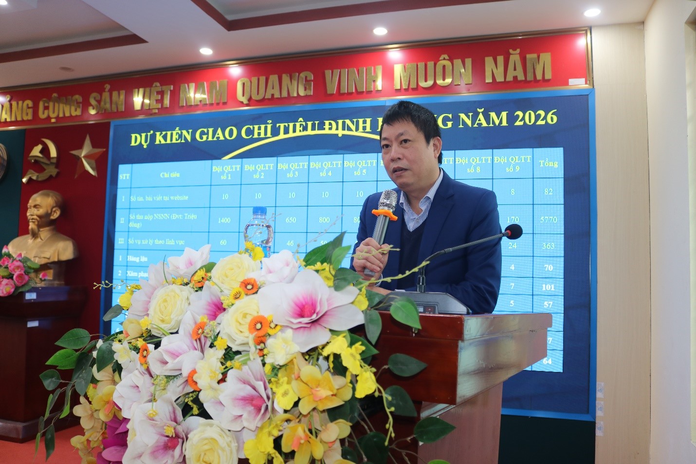 Hội nghị cũng đã thảo luận, thống nhất phương hướng, nhiệm vụ năm 2026, chỉ tiêu định hướng, kế hoạch công tác năm và Quy chế làm việc; đồng thời tập trung vào thảo luận về nâng cao năng lực lãnh đạo của tổ chức Đảng; đẩy mạnh phòng, chống buôn lậu, gian lận thương mại và hàng giả, nhất là trên môi trường thương mại điện tử; tăng cường kỷ cương, kỷ luật công vụ; xây dựng lực lượng QLTT chính quy, chuyên nghiệp, hiện đại, đáp ứng yêu cầu nhiệm vụ trong giai đoạn mới...